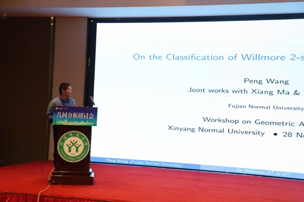第三场报告中,福建师范大学王鹏教授作了题为《On the classification of Willmore 2-spheres in the n-sphere》的学术报告,由中国科公司大学焦晓祥教授主持。王教授在报告中完整分类了所有Willmore二维球面,将其分为三类:(1)满足“法向水平”条件的特殊扭量曲线投影;(2)具平面末端的严格m-各向同性Rn空间极小曲面;(3)由特定严格m-各向同性极小曲面经(mk)步伴随变换导出的严格k-各向同性Willmore球面。