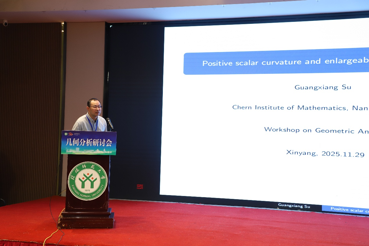 第二场报南开大学苏广想教授带来,他以《Positive scalar curvature and enlargeable foliated manifolds》为题展开了深入讲解。报告由西南大学/贵州师范大学周家足教授主持。苏教授的演讲聚焦于“可扩流形”这一由Gromov和Lawson引入的核心概念。他首先总结了该领域的两个关键结论:一是闭可旋可扩流形上不存在正数量曲率度量,二是Hanke与Schick证明的此类流形上罗森伯格指数不消失。苏教授以此为基石,引领听众共同探索这些经典结论在叶状流形中的精彩推广与应用。