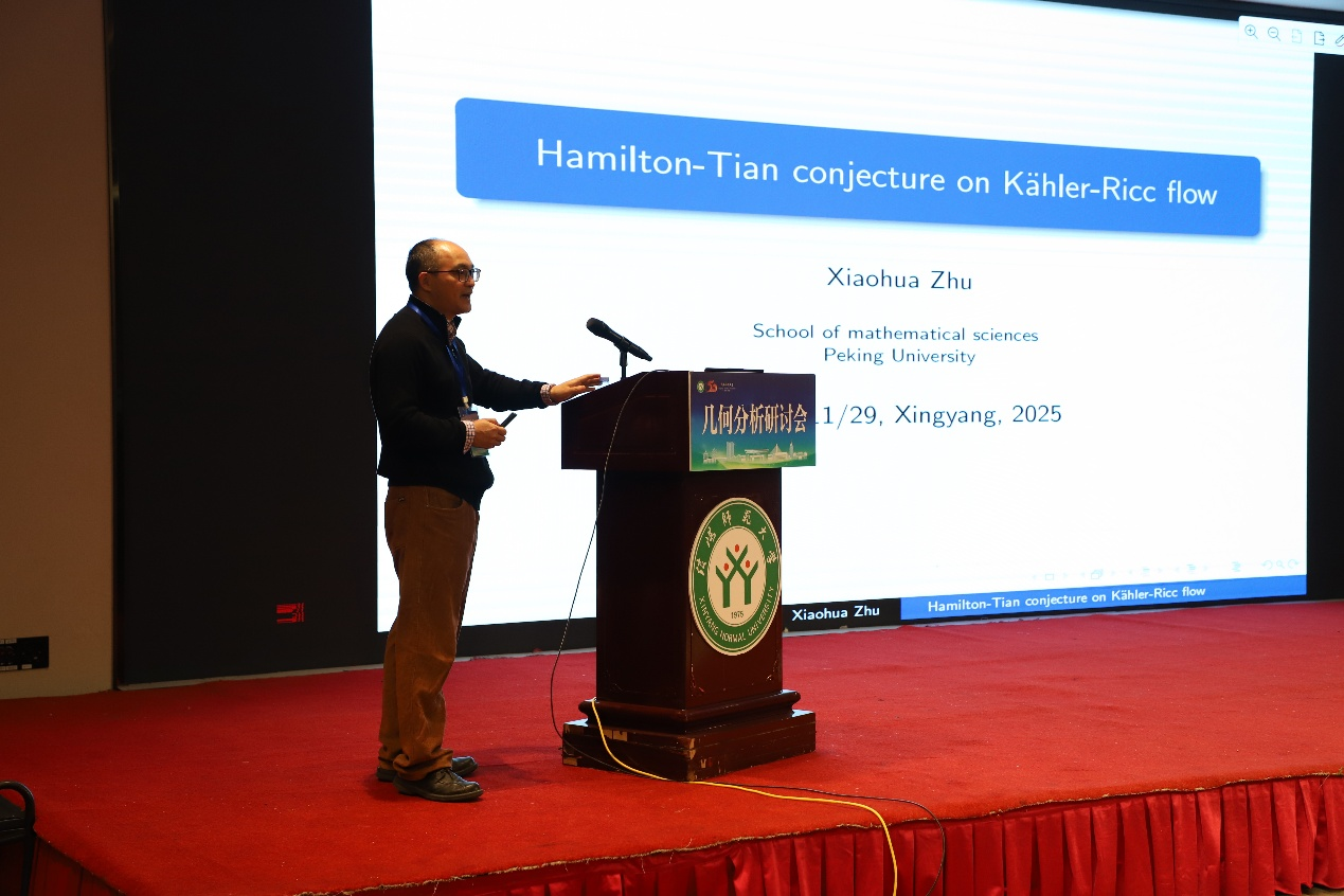 第一场报告由北京大学朱小华教授带来,题为《Hamilton-Tian conjecture on Kaehler-Ricci flow》。本场报告由中国科公司数学与系统科学研究院/广州大学的王友德教授主持。朱教授系统回顾了近二十年来关于法诺流形上凯勒–里奇流中 Hamilton–Tian猜想的研究进展,并重点介绍了一种研究该问题的新思路——借助带Bakry–Émery 里奇曲率的共形几何方法。